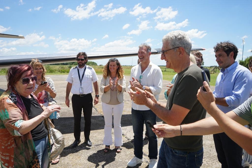 «Hoy es un día histórico y de celebración. La vuelta de los vuelos comerciales a nuestra ciudad fortalece el turismo y nuestra conectividad con todo el país», destacó el intendente Gustavo Barrera, quien recibió a los primeros turistas y le entregó regalos junto al secretario de Turismo, Emiliano Felice.
