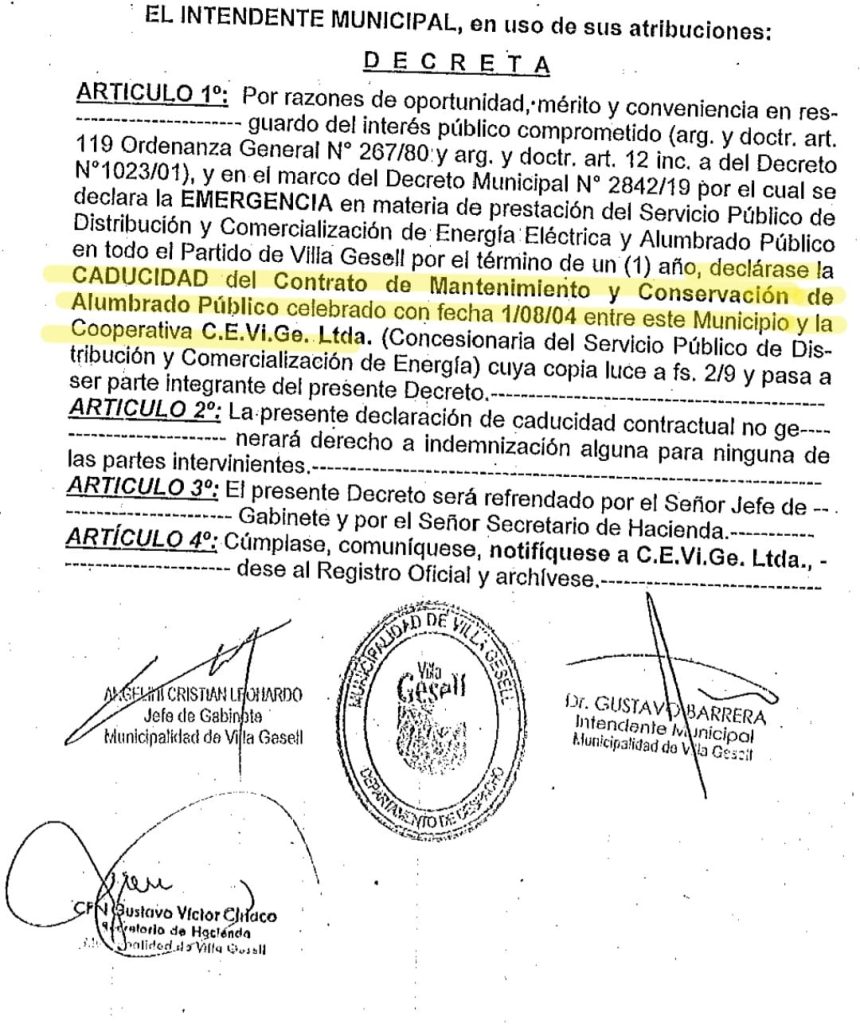 La Cooperativa Eléctrica de Villa Gesell informa a la comunidad que el servicio de mantenimiento y conservación del alumbrado público no se encuentra bajo su responsabilidad desde el año 2019, cuando la Municipalidad dispuso la baja del contrato mediante el Decreto N.º 2844/19, que dejó a la Cooperativa fuera de estas tareas.