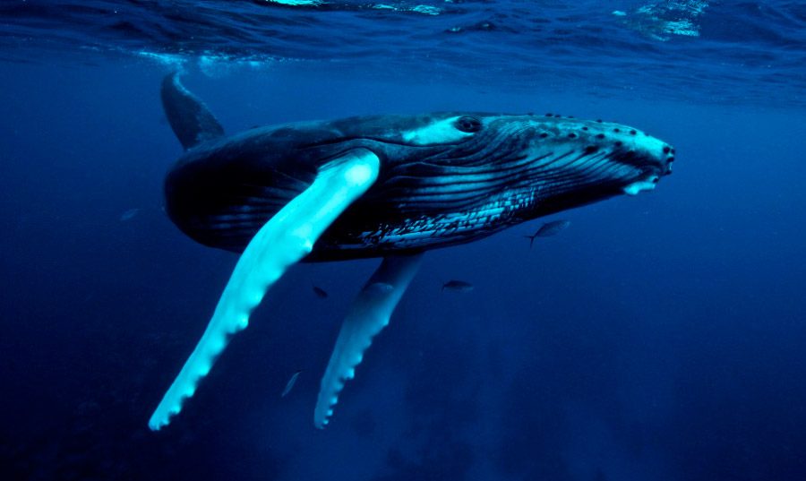 Esta especie se denomina también como jorobada (Megaptera novaeangliae), toma su nombre común debido a la forma de su aleta dorsal y el aspecto que adopta su cuerpo cuando se encuentra sumergiéndose. De hecho, su nombre científico, Megaptera, significa “gran alado”, y se refiere a sus largas y blancas aletas en forma de ala, que a menudo pueden llegar a ser tan grandes como un tercio de la longitud de todo su cuerpo.