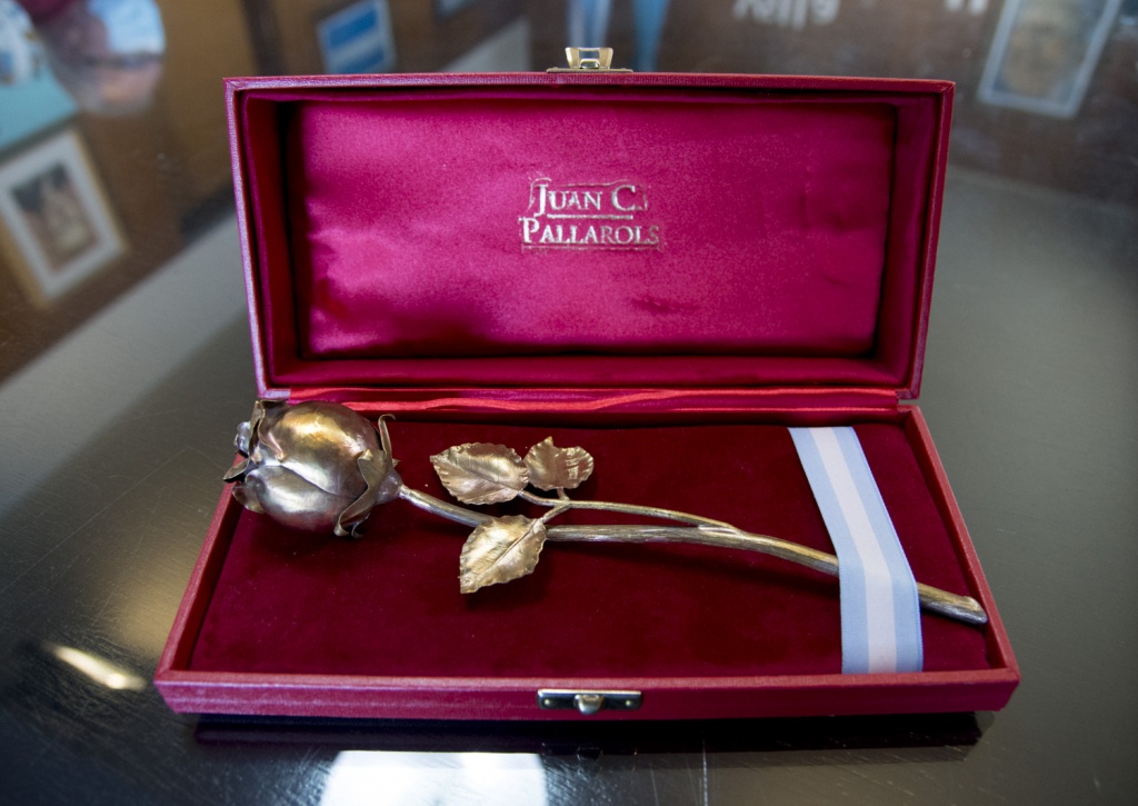 La pieza que se subastará será “Dos rosas por la Paz” del maestro orfebre Juan Carlos Pallarols que forma parte de una artesanía colectiva iniciada en su taller. La rosa fue elaborada en bronce a partir de la fundición, y posterior forjado de vainas servidas y material bélico proveniente del conflicto entre argentinos y británicos en las Islas Malvinas, con el objetivo de transformar las armas en arte.